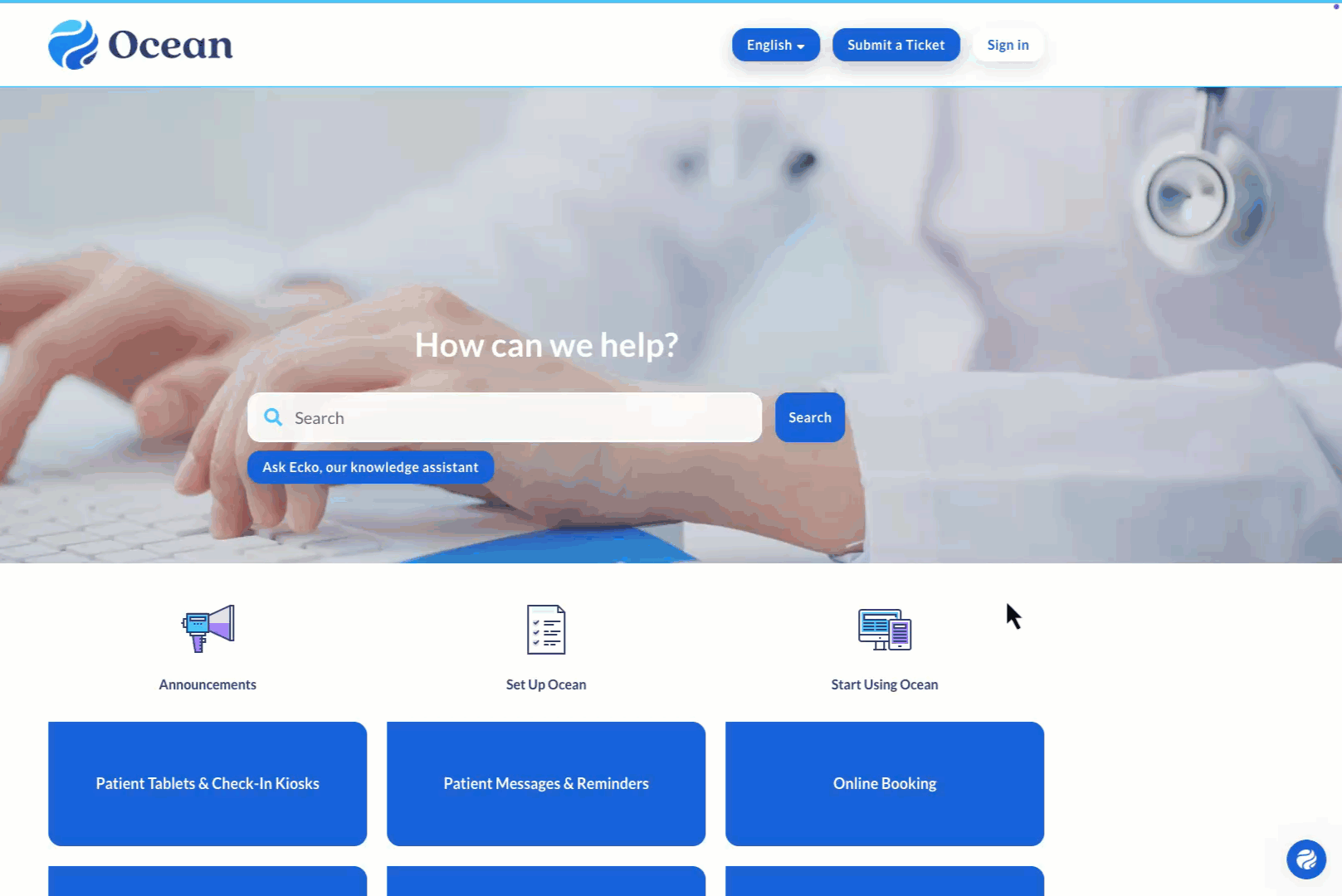 ECKO is our AI-powered support companion that uses a wealth of Ocean resources to provide helpful information and advice. More than just a librarian, ECKO was designed to help with all kinds of questions, from “How would I configure reminders for specialist appointments?” to “What are some ways to handle missed forms in the waiting room?”